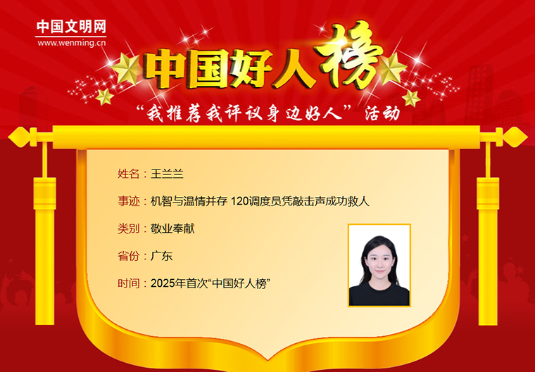 王蘭蘭,女,1995年8月生,廣東省佛山市醫(yī)療急救指揮中心調(diào)度員。2025年1月6日凌晨,王蘭蘭接到一通“無聲”的呼救電話,一名22歲的呼救者突發(fā)失語及運(yùn)動(dòng)功能障礙。王蘭蘭憑借豐富經(jīng)驗(yàn),引導(dǎo)對(duì)方通過敲擊聲確認(rèn)事發(fā)地址與基本情況,精準(zhǔn)定位并調(diào)派救護(hù)車。同時(shí),她用耐心和溫情與患者保持通話14分鐘,安撫對(duì)方情緒,直至救護(hù)車到達(dá),最終成功救助該患者。