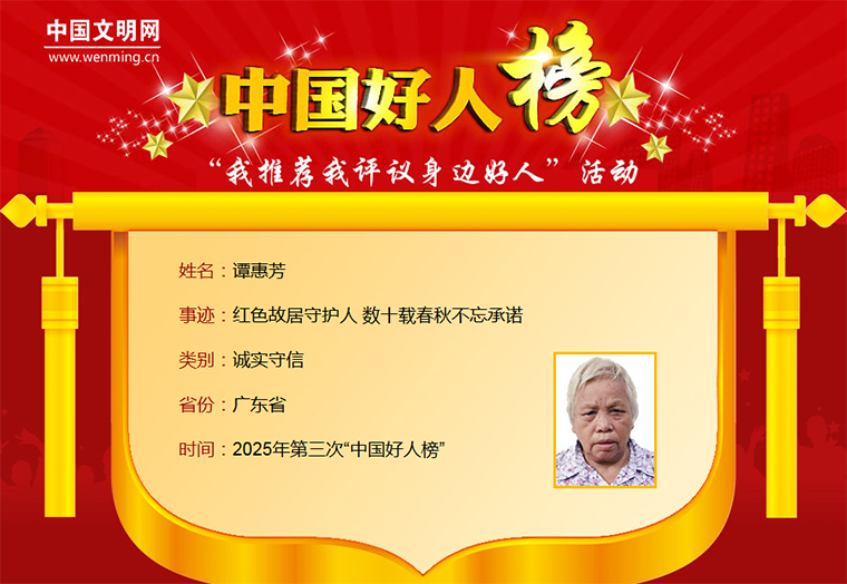 譚惠芳,女,1948年9月生,廣東省佛山市高明區(qū)明城鎮(zhèn)明陽村村民。譚惠芳的父親是革命先輩譚天度的侄子,由于譚天度其子女后輩多居于國外,譚惠芳和母親、哥哥自發(fā)擔負起看護譚天度故居的責任。在母親和哥哥去世后,譚惠芳仍堅守諾言,看護故居,一守就是70多年。譚惠芳曾獲全國最美文物安全守護人、南粵紅色守護人、“廣東好人”等榮譽。