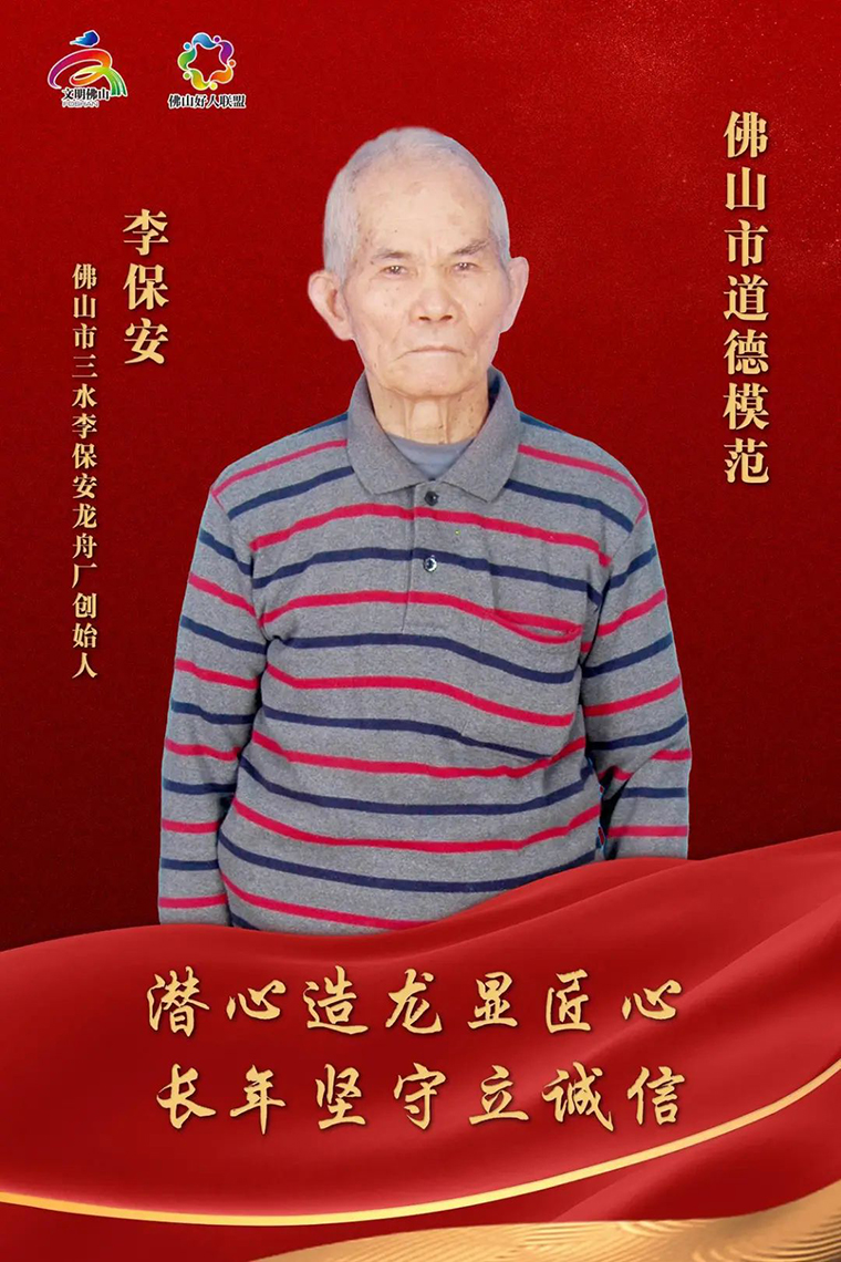 李保安,年近九旬,佛山市三水李保安龍舟廠創(chuàng)始人,佛山市級非遺項目三水龍舟制作(洲邊)傳承人。多年來,他嚴(yán)格把關(guān)龍舟制作的每一個環(huán)節(jié),誠信經(jīng)營,為客戶量身打造龍舟,他常說:“寧愿少做十條,也不做差一條?!边@位老人用堅守和創(chuàng)新,讓“三水李保安造”成為大名鼎鼎的“金字招牌”。