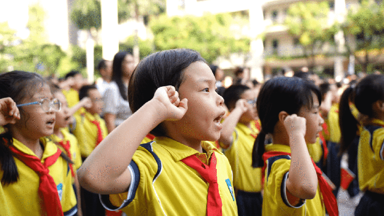 朝陽(yáng)下,同學(xué)們胸前的紅領(lǐng)巾與頭上的國(guó)旗遙相輝映。從國(guó)旗一角演變而來(lái)的紅領(lǐng)巾,象征著革命精神的傳承與責(zé)任。在主持人的帶領(lǐng)下,現(xiàn)場(chǎng)全體少先隊(duì)員高舉右拳,面向隊(duì)旗莊嚴(yán)宣誓,“我熱愛(ài)中國(guó)共產(chǎn)黨,熱愛(ài)祖國(guó),熱愛(ài)人民,好好學(xué)習(xí),好好鍛煉,準(zhǔn)備著:為共產(chǎn)主義事業(yè)貢獻(xiàn)力量!”誓言字字鏗鏘,擲地有聲。