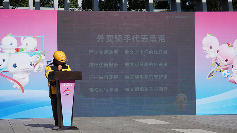 美團(tuán)外賣騎手代表上臺(tái)作出文明出行承諾