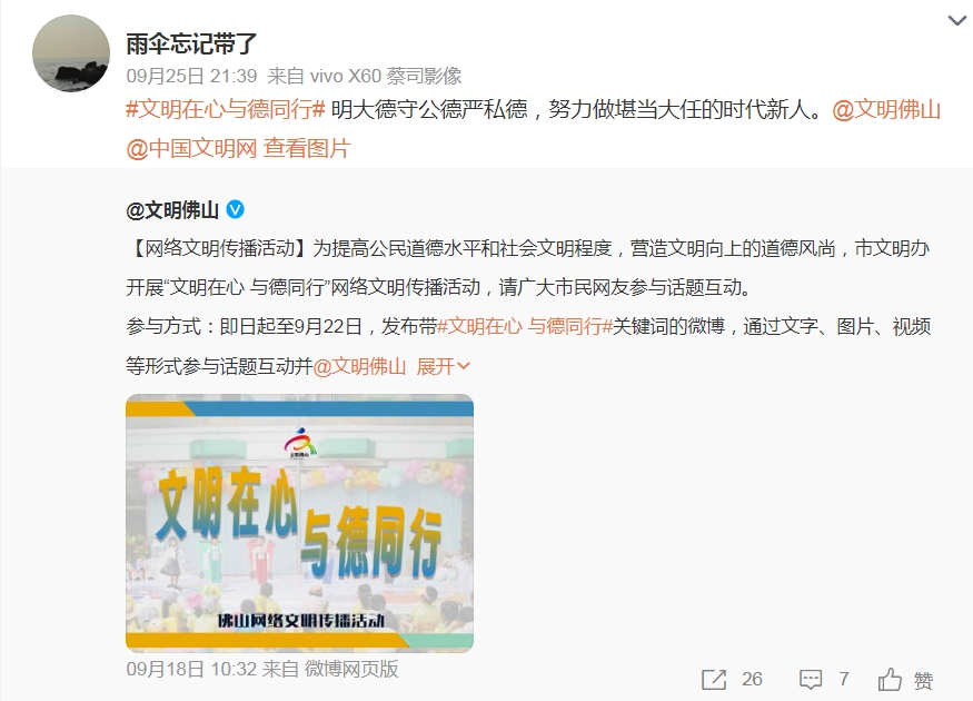 導(dǎo)語:為提高公民道德水平和社會文明程度,營造文明向上的道德風(fēng)尚,市文明辦開展“文明在心 與德同行”網(wǎng)絡(luò)文明傳播活動,邀請市民網(wǎng)友參與互動。